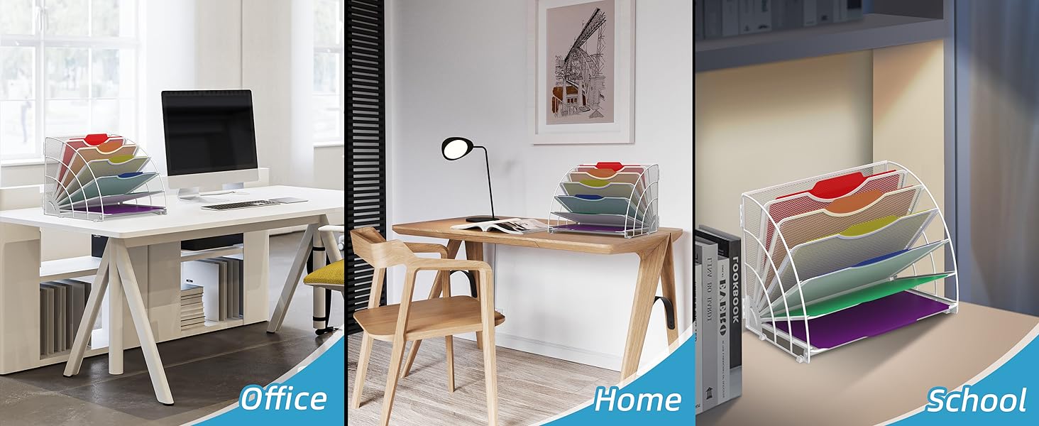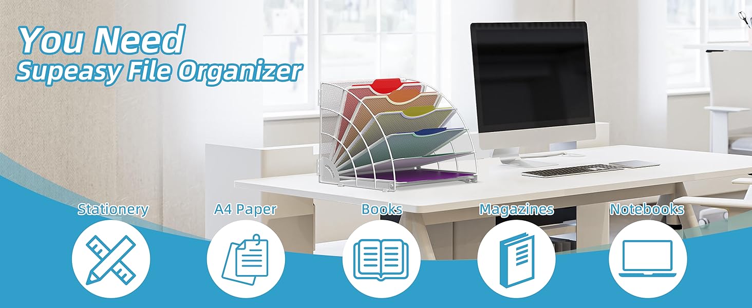 A new addition to our"Supeasy" shop, this white fan-shaped desktop file organizer with 6 compartments is made of metal mesh, sturdy and functional, it adds a classic and stylish look to any office or desk, it's also perfect for storing all your important documents and files. This is really great.