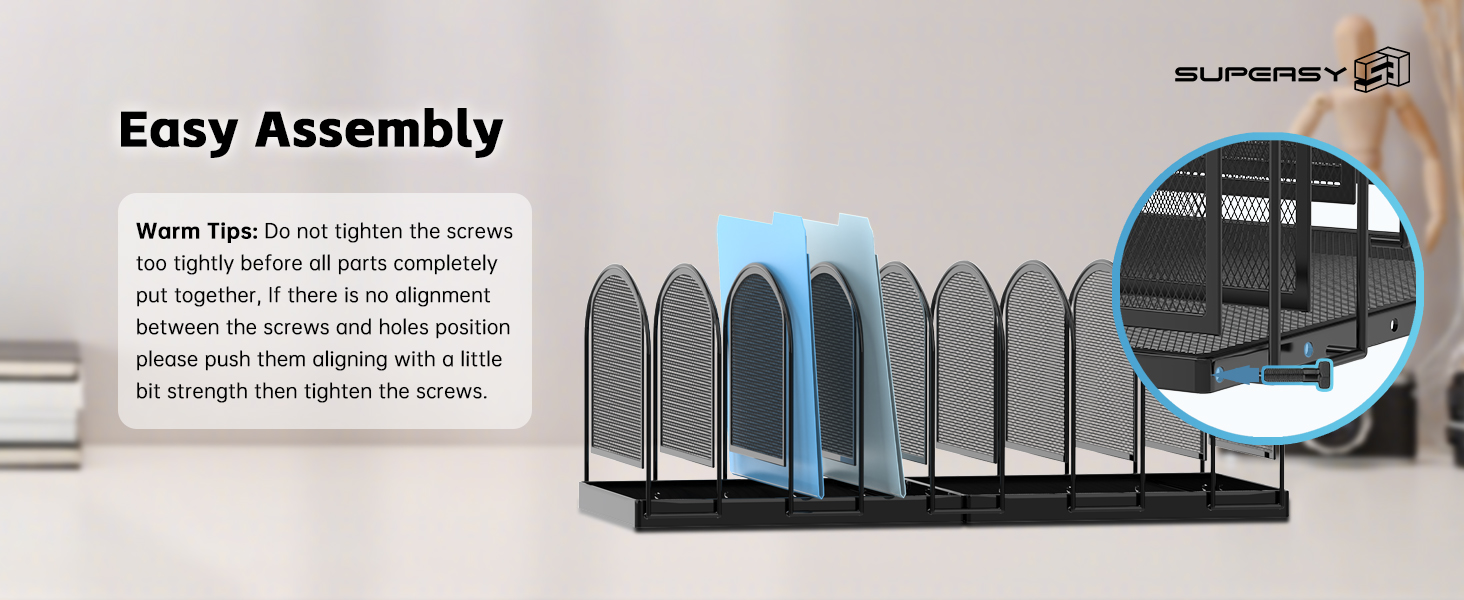 SUPEASY folder holder measures 8.27 "H x 9. 45 "D x 21.65" W and is very easy to assemble on the holder desk, just tighten a few screws, so you can use it faster, giving you a better experience.